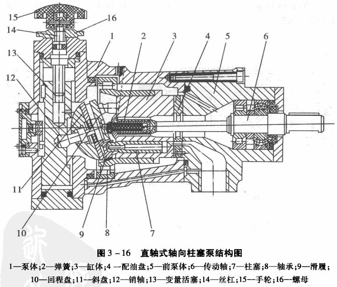 1)典型結構。圖3 -16為液壓機一直軸式軸向杜塞泵的結構圖。官由斜盤11、柱塞7、缸體3、配油盤4、傳動軸6等組成。柱塞的球狀頭部裝在滑履9內,以缸體為支撐的彈簧2通過鋼球推壓回程盤10,回程盤和柱塞滑履一同轉動。在排液過程中借助斜盤11推動柱塞作軸向運動;在吸油時依靠回程盤、鋼球和彈簧組成的回程裝置將滑履緊緊壓在斜盤表面上滑動,彈簧2一般稱為回程彈簧,這樣的泵具有自吸能力。在液壓機滑履與斜盤相接觸的部分有一油室,它通過柱塞中間的小孔與缸體中的工作腔相連,壓力油進入油室后在滑履與斜盤的接觸面間形成了一層油膜,起著低壓支撐作用,使滑履作用在斜盤上的力大大減小,因而磨損也較小。傳動軸6通過左邊的花鍵帶動缸體3旋轉,由于滑履9貼緊在斜盤表面上,柱塞在隨缸體旋轉的同時在缸體內作往復運動。缸體中柱塞底部的密封工作容積是通過配油盤4與泵的進出口相通的。隨著傳動軸的轉動,液壓泵連續(xù)地吸油和排袖向移動(因導向鍵的作用,變量活塞只能作軸向移動,不能轉動)。通過銷軸12使斜盤11繞變量機構殼體上的圓弧導軌面的中心(即為鋼球中心)旋轉,從而使外盤傾角改變,達到變量的目的。當流量達到要求時,可用鎖緊螺母16鎖緊,這種變量機構結構簡單,但操縱較復雜,且不能在工作過程中變量。