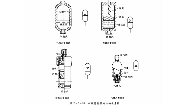 除彈簧式外,它們都是先通過(guò)充氣閥向氣囊或氣缸內(nèi)充入一定壓力的氣體,充氣后將充氣閥關(guān)閉,使氣體被封閉在氣囊或氣缸內(nèi)。工作時(shí),油液從蓄能器下部的液壓油人口進(jìn)入蓄能器,壓縮氣體直至達(dá)到平衡,這樣在蓄能器氣囊或氣缸下方的腔體內(nèi)就儲(chǔ)存了一定壓力的液壓油。其他的蓄能器的工作原理類似。