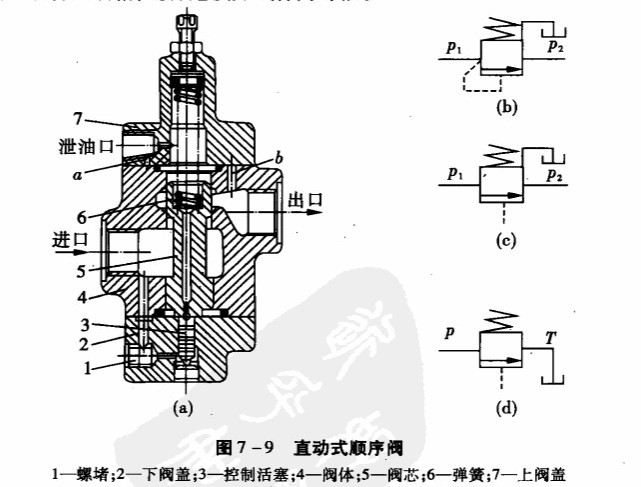 若將下閥蓋2相對(duì)于閥體轉(zhuǎn)過90°或180°,將螺堵1拆下,在該處接控制油管并通入控制油,則閥的啟閉便由外供控制油控制。這時(shí)即成為液控順序闊,其圖形符號(hào)如圖7 -9(c)所示。若再將上閥蓋7轉(zhuǎn)過1800,使泄油口處的小孔α與閥體上的小孔b連通,將泄油口用螺堵封住,并使順序闊的出油口與油箱連通,則順序間就成為卸荷閥己其泄漏油可由闊的出油口流回油箱,這種連接方式稱為內(nèi)泄。卸荷闊的圖形符號(hào)如圖7 - 9 (d)所示。