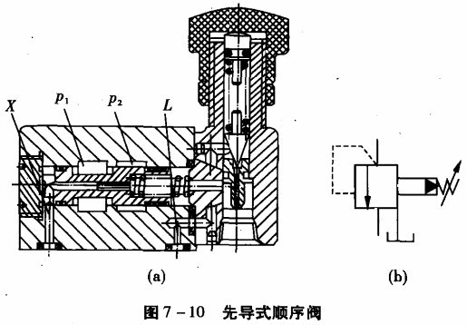 先導(dǎo)式順序閥與直動(dòng)式順序閥一樣也有內(nèi)控外泄、外控外泄和外控內(nèi)泄的控制方式,圖7-lO(a)所示為先導(dǎo)式順序闊的結(jié)構(gòu)原理圖,圖7 -10Cb)為內(nèi)控外泄式先導(dǎo)順序閥的圖形 符號(hào)。