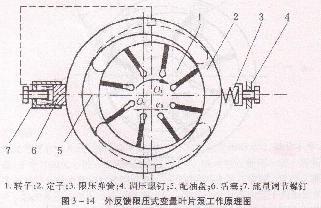 單作用式葉片泵的變量方法是改變其偏心距e的大小,偏心距可通過(guò)手動(dòng)調(diào)節(jié),也可自動(dòng)調(diào)節(jié)。自動(dòng)調(diào)節(jié)的變量泵可根據(jù)其工作特性的不同分為限壓式、恒壓式和恒流量式三類(lèi),其中以限壓式應(yīng)用較多。
